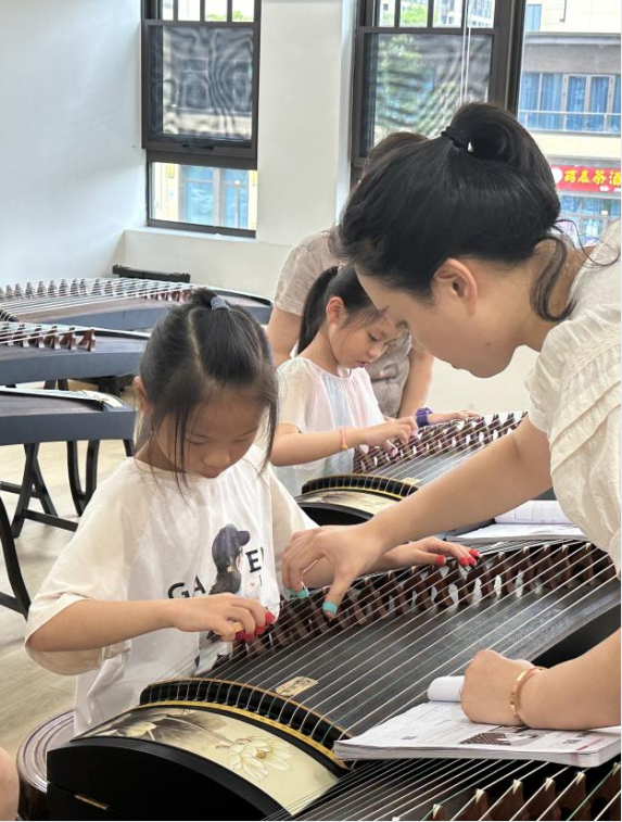 课堂上,指导老师首先对古筝基本构造、演奏姿势、义甲的佩戴以及古筝的发声原理等展开教学。循序渐进的将基本指法结合到熟悉的曲目中,让学员们对相关指法进行针对性的训练,并逐个进行指导。耐心培养大家的乐感,提高了学生对古筝的认识和兴趣,使学生们在很短时间内掌握了一定的知识。