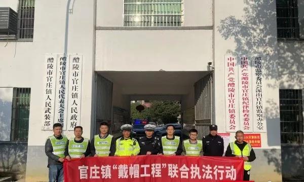 官庄镇还联合交警大队五中队、枫林派出所开展"戴帽工程"专项整治行动,严查骑行摩托车、电动车未戴头盔和加装雨棚等交通违法行为,发现一起,当场处理一起。同时,通过宣传海报、展板、广播对来往村民进行宣传。