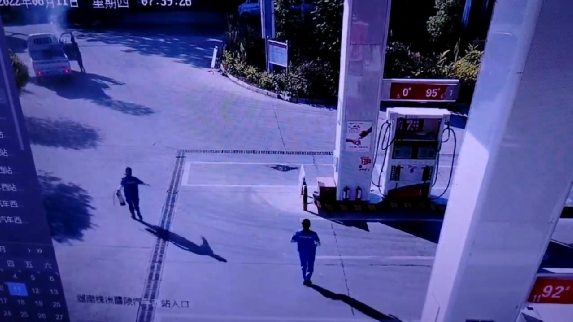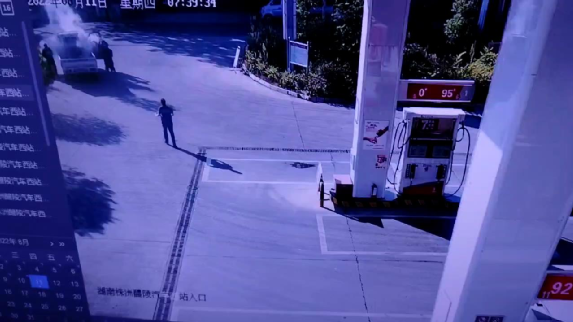 早上7时39分,正值城西加油站工作人员进行交接班,一辆白色五蓌小货车缓缓驶入城西加油站,加油员易慧敏上前引导车辆停靠在了1号加油机边上。车辆熄火后,加油员询问加注油品品类。加油员易慧敏刚拿起油枪,一回头突然发现车上货厢内冒出一丝烟,"赶快驶离""起火了,起火了",加油员易慧敏大声呼叫小货车驾驶员立即将车驶出加油区域,加油站综合员马丹听到呼喊后跑出来并引导货车停留到安全区域。刚停稳,车辆货厢物品突然冒起浓烟。