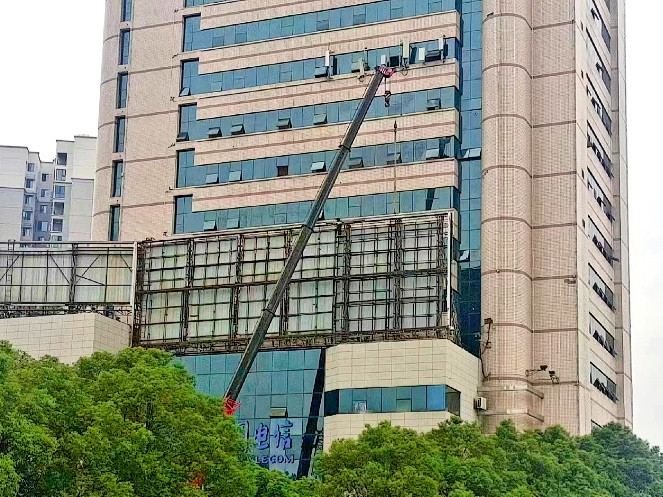 该广告牌设置于2008年,依附电信大楼外立面5层至8层位置,呈"七"字型,长70米、高12米,面积达840平米。因设置年份已达15年,整个钢架结构锈蚀严重,同时该广告牌已不符合目前户外广告设置技术规范要求,为此,市城管局工作人员多次耐心细致地上门宣传、解读政策,督促业主单位进行拆除。