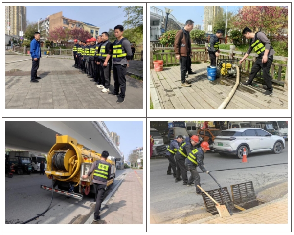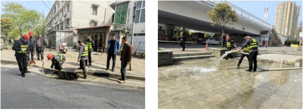 接到应急抢险指令后,市政工程维护中心迅速在现场拉起警戒线,严格按照应急预案流程,明确分工、协同作战,有序开展洪水抽排和泄水井疏通等应急抢险工作,确保雨水管道排放畅通。