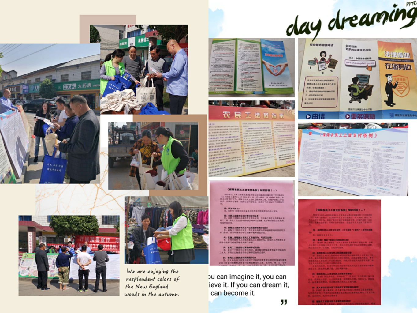 活动期间,法律援助中心工作人员进到工厂开展宣传活动,为农民工发放宣传资料,同时,引导用人单位增强依法用工、按时足额支付工资的法律意识,形成了有利于预防和解决拖欠农民工工资问题的强大声势和舆论氛围。