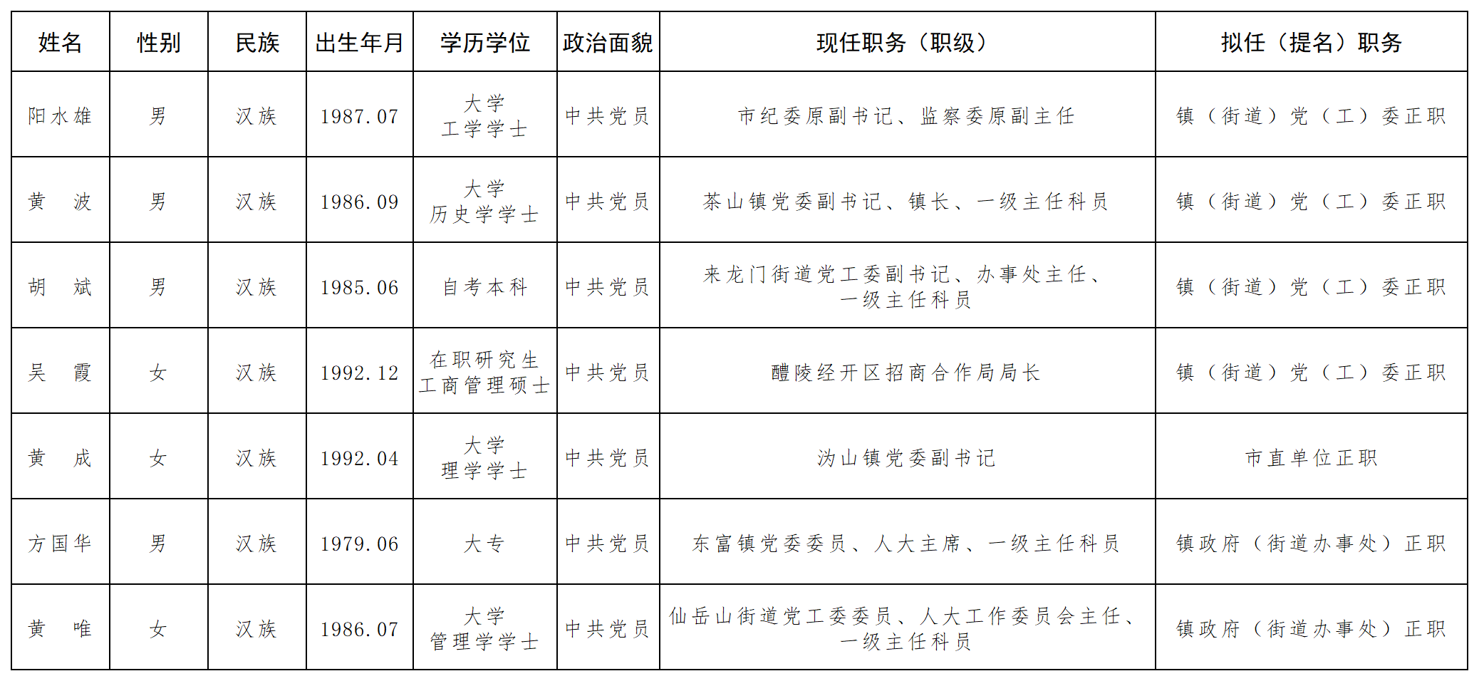 为了加强对干部选拔工作的监督,提高识别和任用干部的准确程度,现对市委常委会会议研究决定的下列拟任人选进行任前公示:
