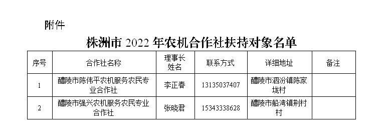 根据《株洲市农机事务中心关于下发〈株洲市2022年扶持农机合作社实施方案〉的通知》 (株农机通字〔2022〕15号)文件精神,经创建主体自主申报,以下我市两家(名单见附件)农机合作社经农机事务中心组织实地核查、集中评审,符合株洲市2022年农机合作社扶持条件,特批准为株洲市2022年农机合作社扶持对象,现予以公示。