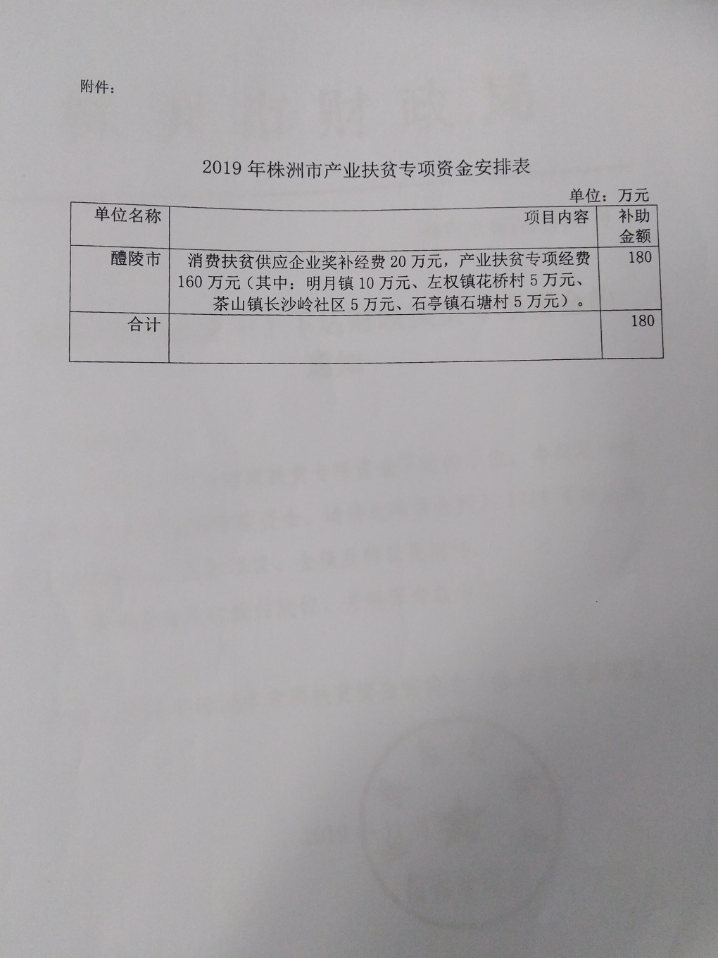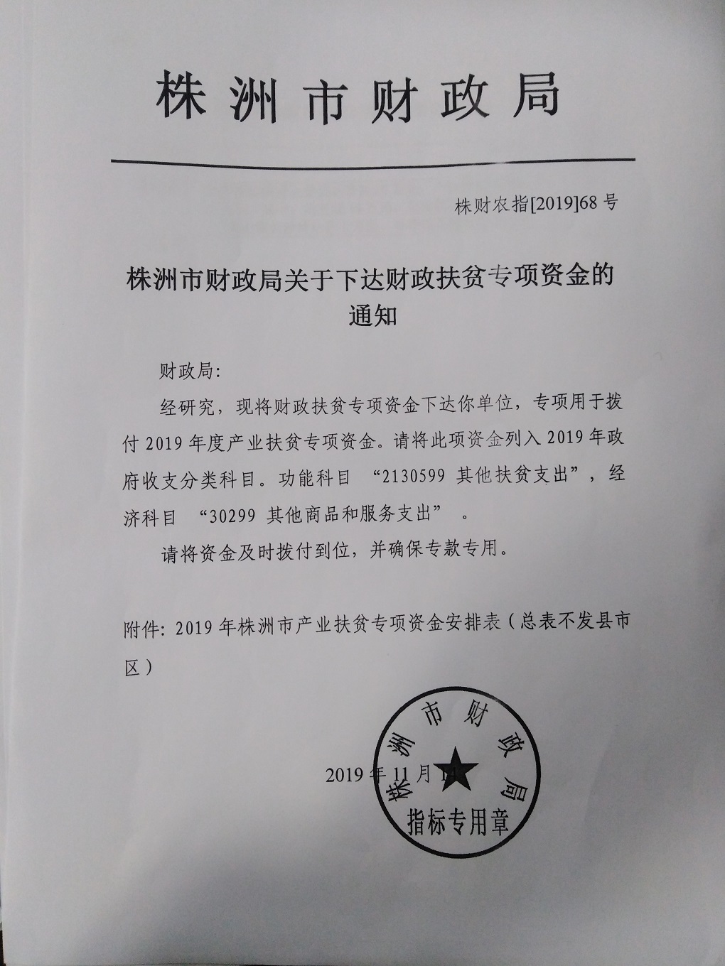 株洲市财政局关于下达财政扶贫专项资金的通知(株财农指【2019】68号)
