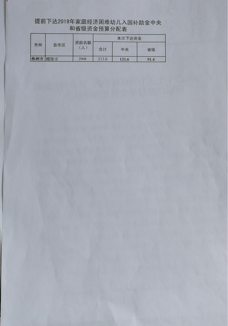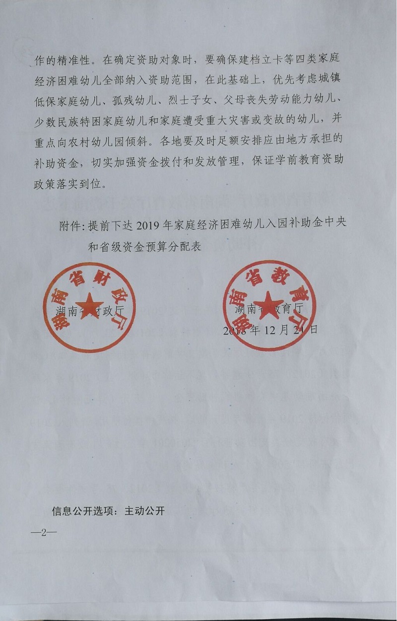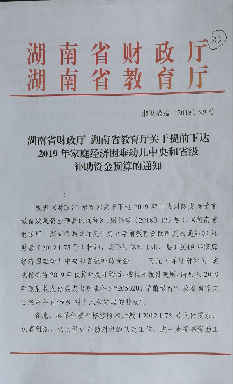 2019年家庭经济困难幼儿中央和省级补助资金(湘财教指【2018】99号)