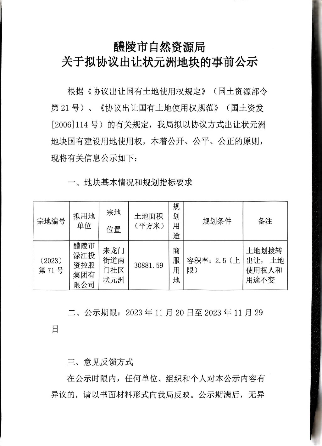 醴陵市自然资源局关于拟协议出让状元洲地块的事前公示
