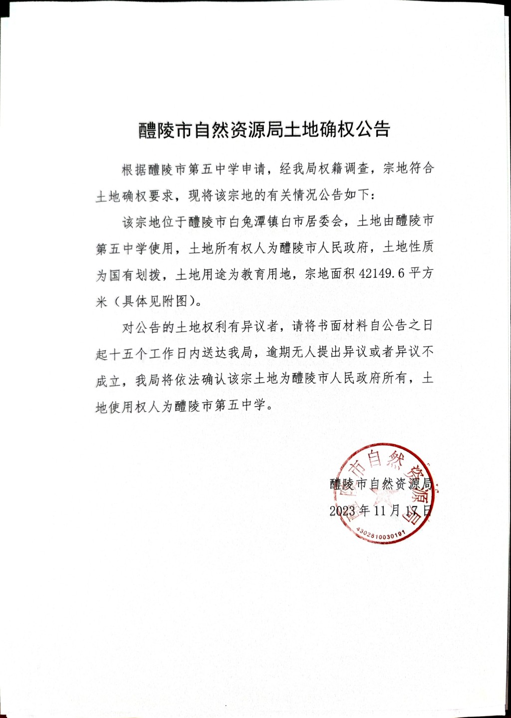 醴陵市自然资源局土地确权公告(醴陵市第五中学)
