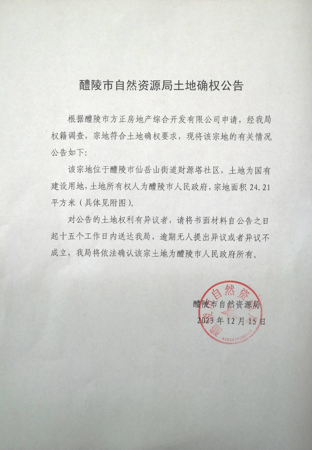 醴陵市自然资源局土地确权公告(醴陵市人民政府)
