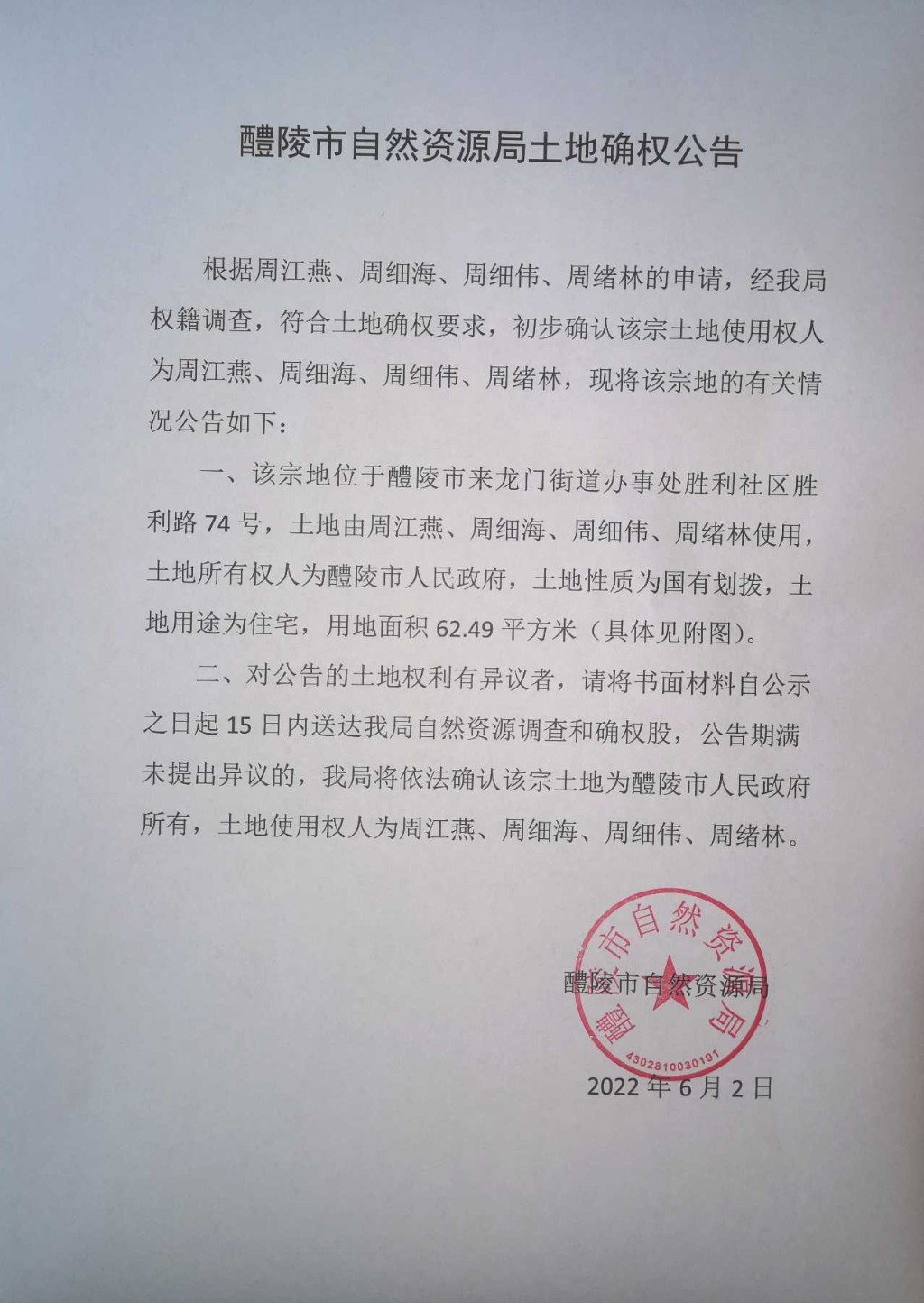 醴陵市自然资源局土地确权公告 (周江燕、周细海、周细伟、周绪林)