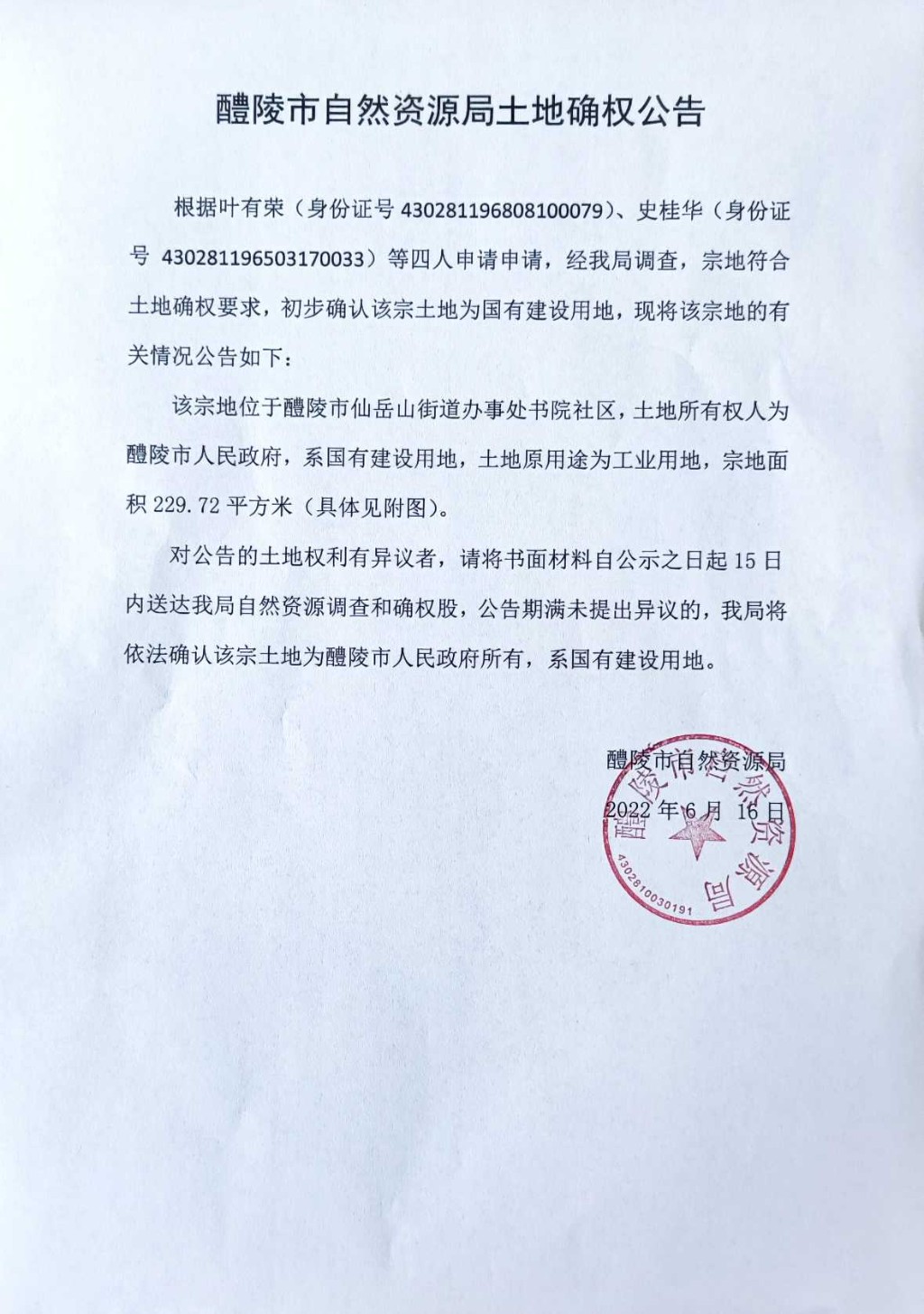 醴陵市自然资源局土地确权公告(叶有荣、史桂华等四人)