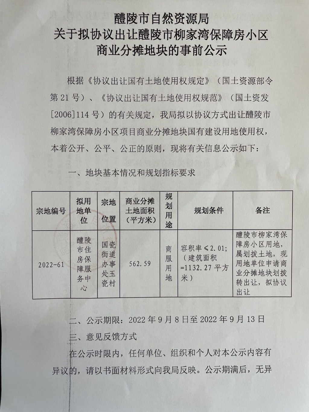 醴陵市自然资源局关于拟协议出让醴陵市柳家湾保障房小区商业分摊地块的事前公示