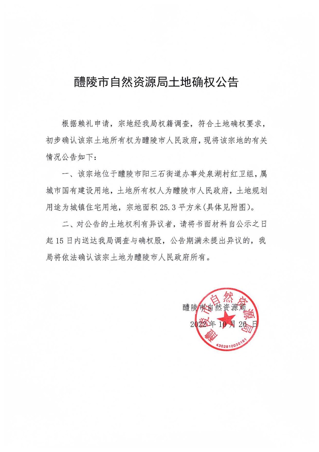 醴陵市自然资源局土地确权公告(醴陵市人民政府)