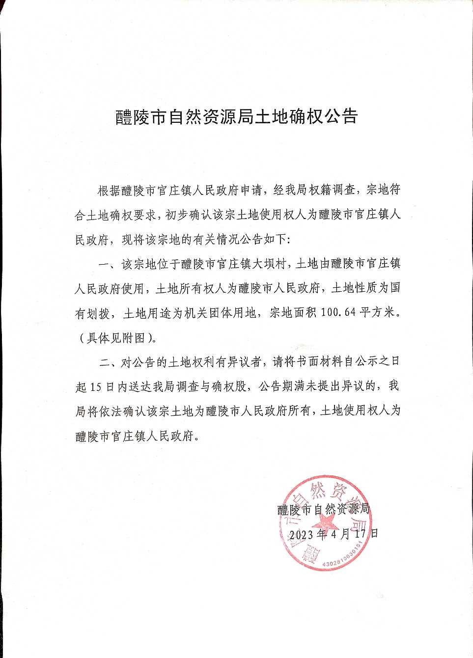 醴陵市自然资源局土地确权公告(官庄镇人民政府)