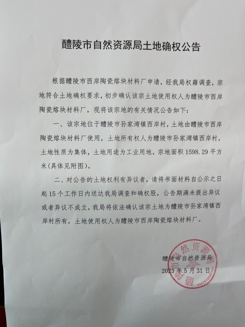醴陵市自然资源局土地确权公告(醴陵市西岸陶瓷熔块材料厂)