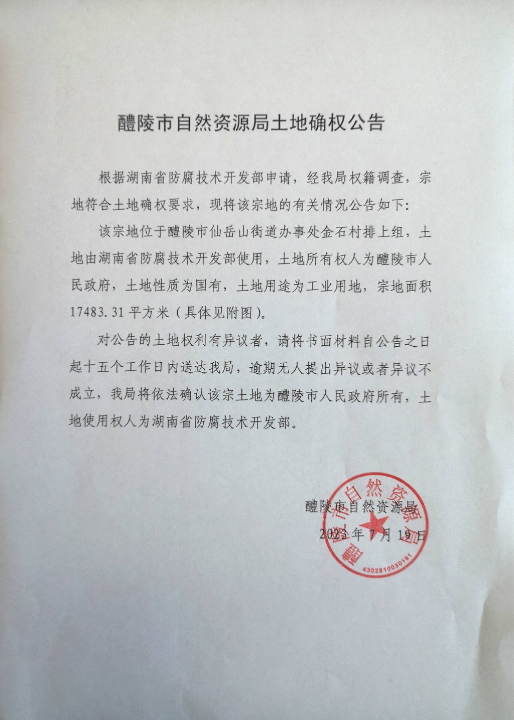 醴陵市自然资源局土地确权公告(湖南省防腐技术开发部)