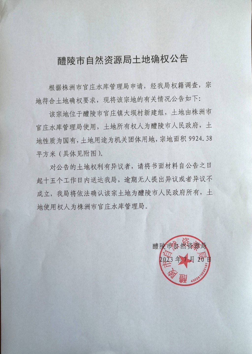醴陵市自然资源局土地确权公告(株洲市官庄水库管理局)