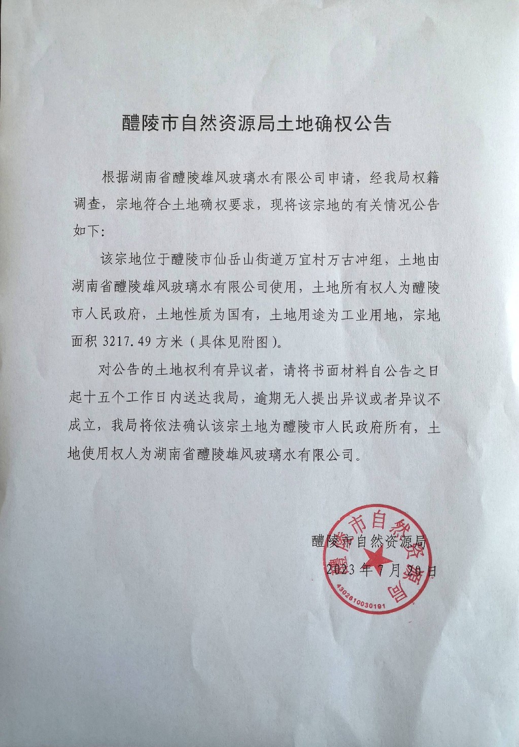 醴陵市自然资源局土地确权公告(湖南省醴陵雄风玻璃水有限公司)