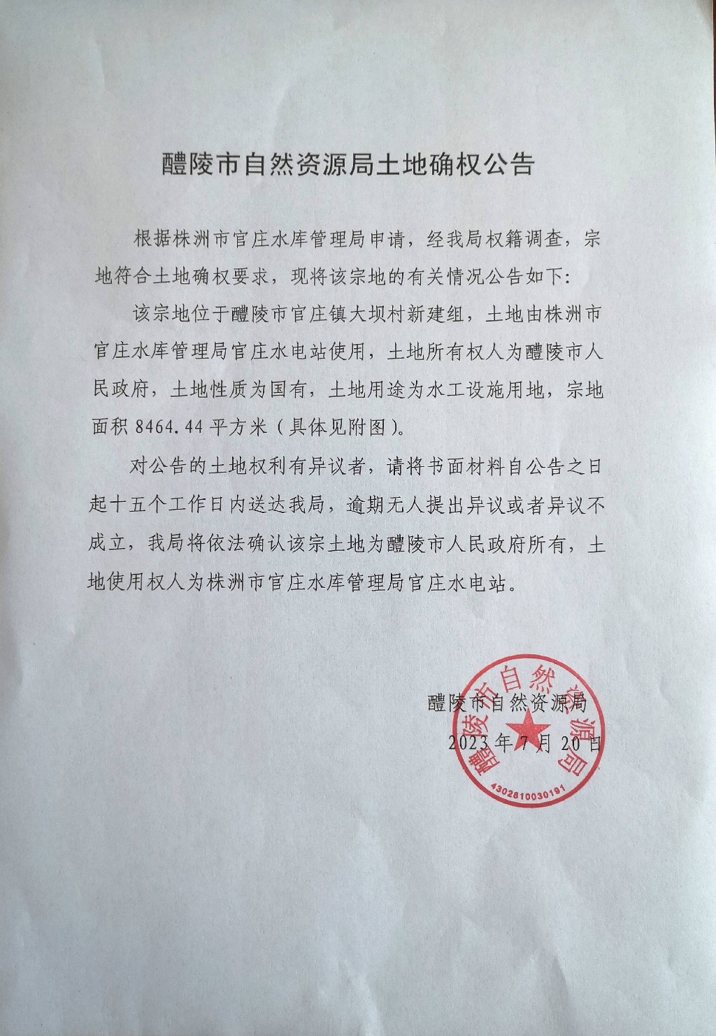 醴陵市自然资源局土地确权公告(株洲市官庄水库管理局官庄水电站)
