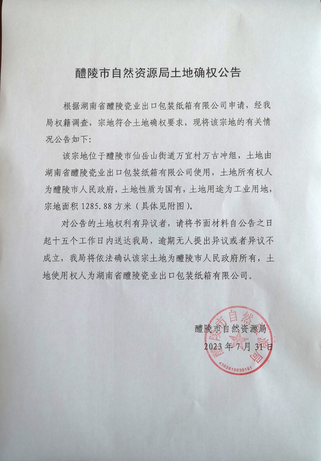 湖南省醴陵瓷业出口包装纸箱有限公司1285