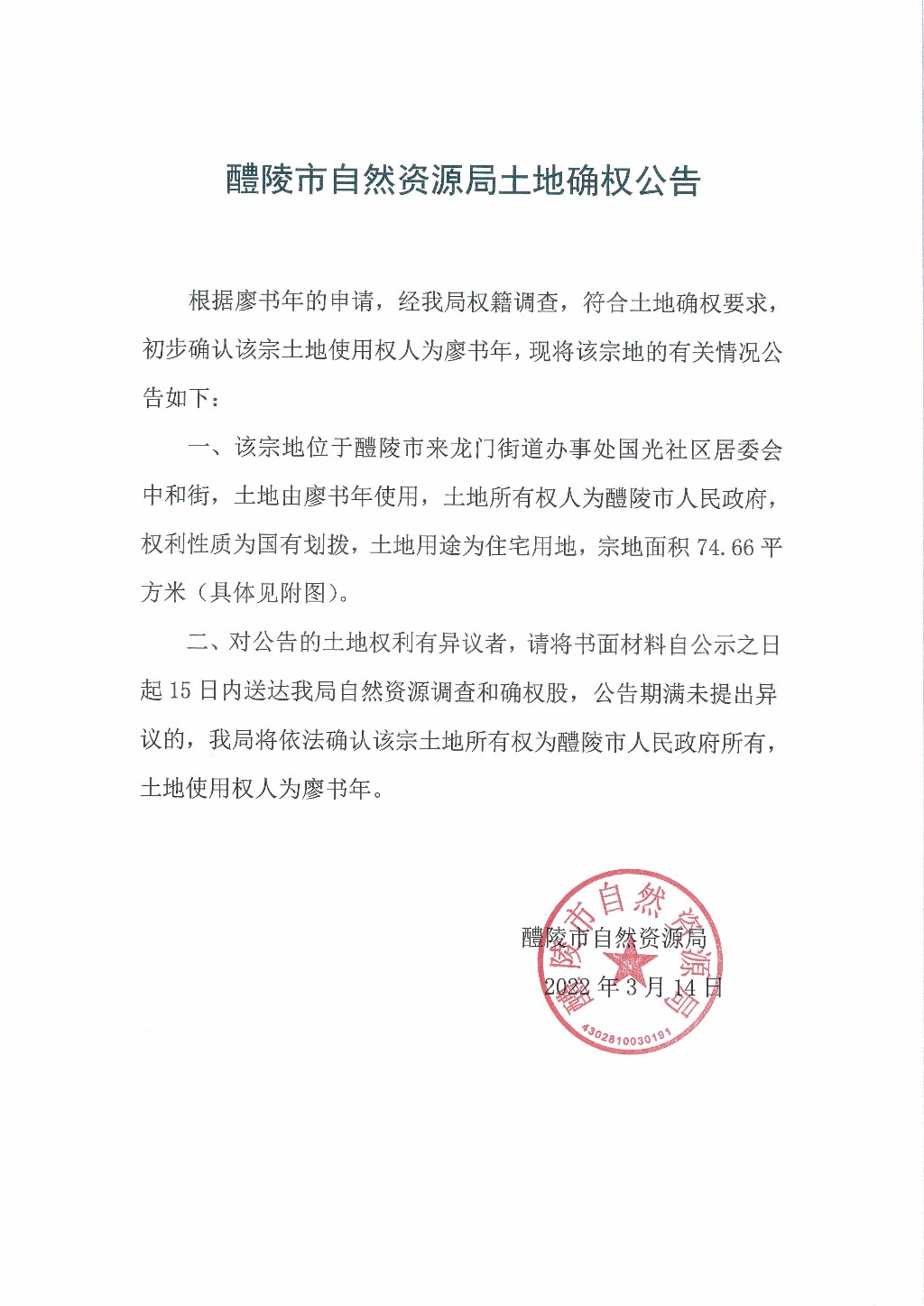 醴陵市自然资源局土地确权公告(廖书年)