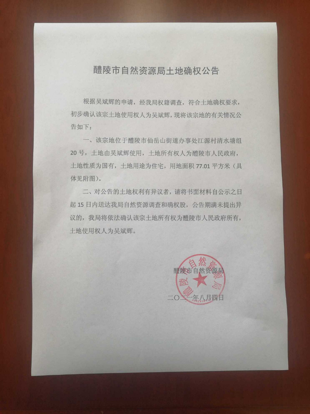 醴陵市自然资源局土地确权公告(吴斌辉)