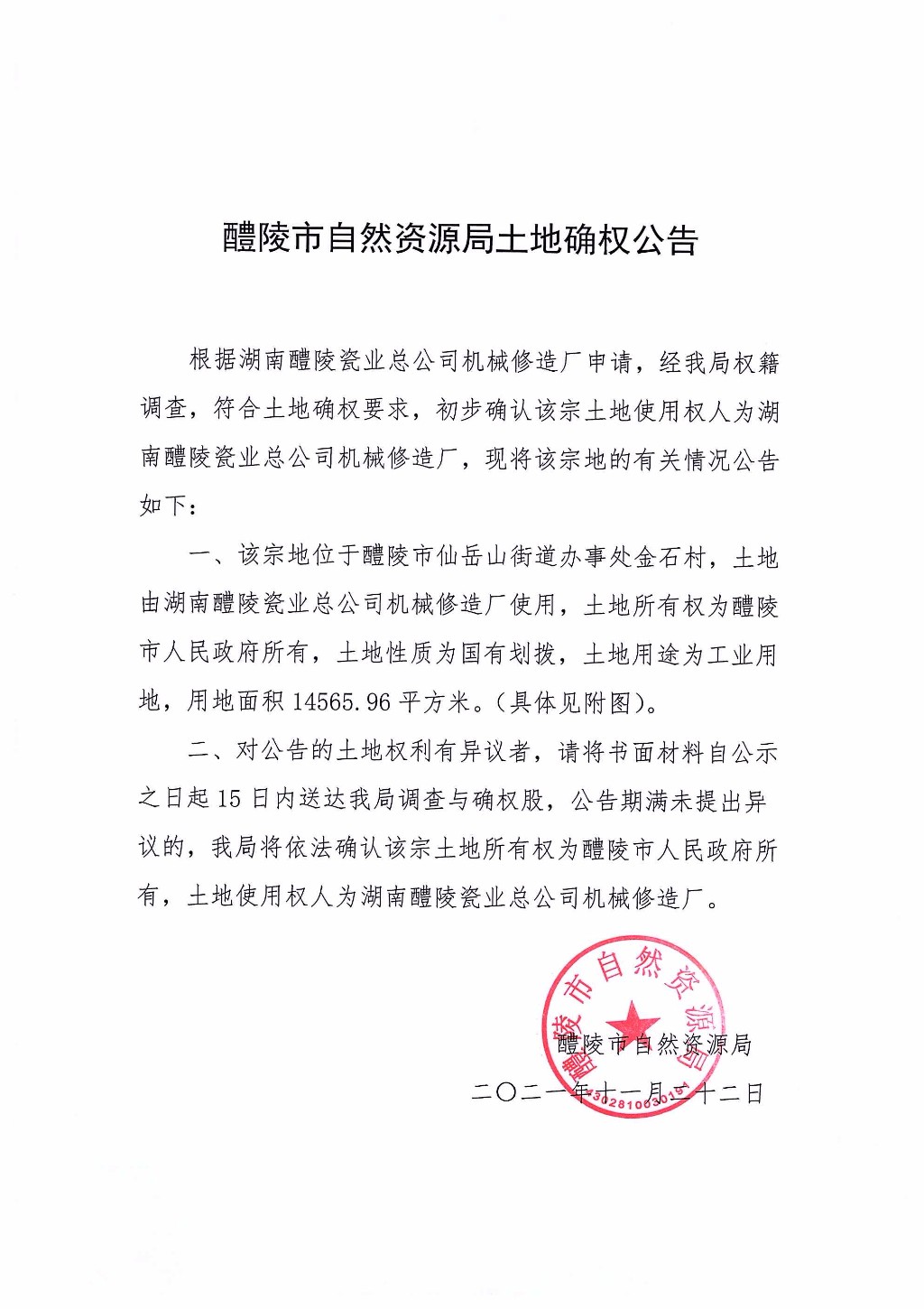 醴陵市自然资源局土地确权公告(醴陵瓷业总公司机修厂)