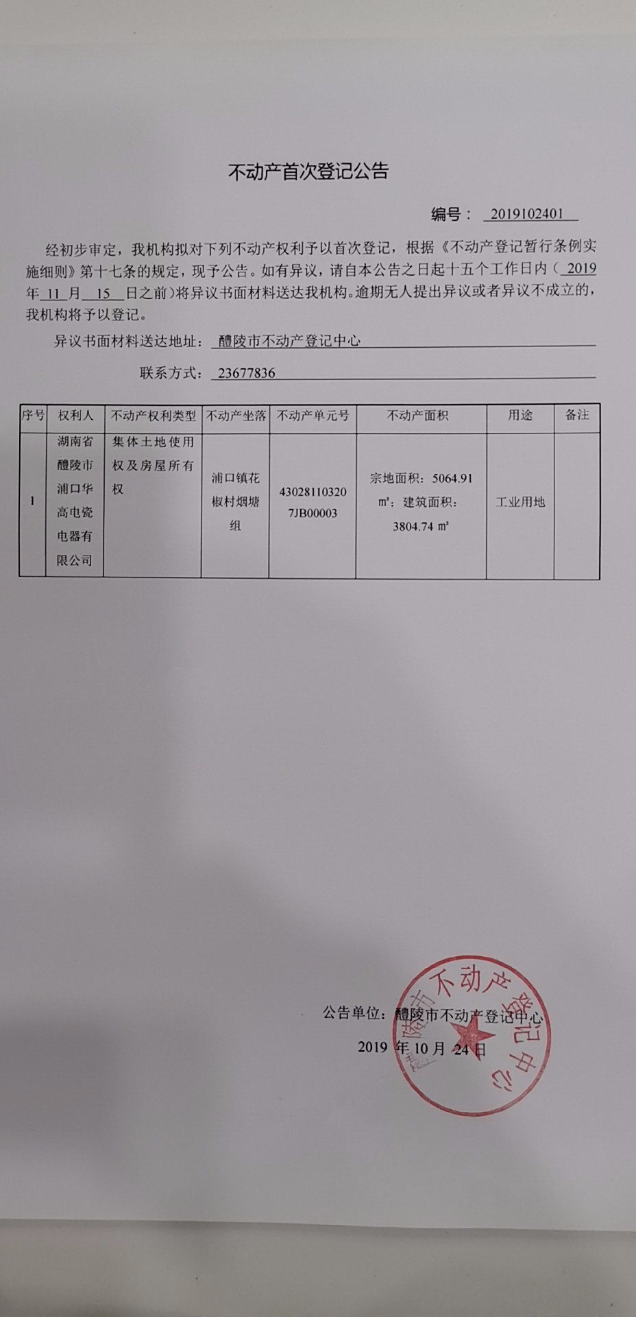 不动产首次登记公告(湖南省醴陵市浦口华高电瓷电器有限公司)
