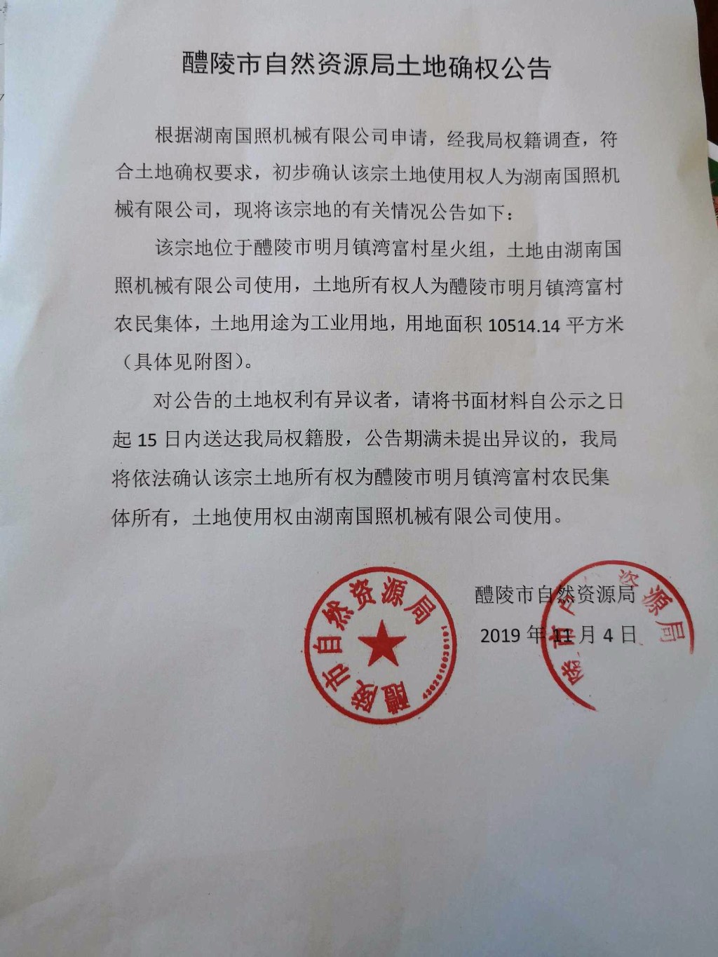 醴陵市自然资源局土地确权公告(湖南国照机械有限公司)