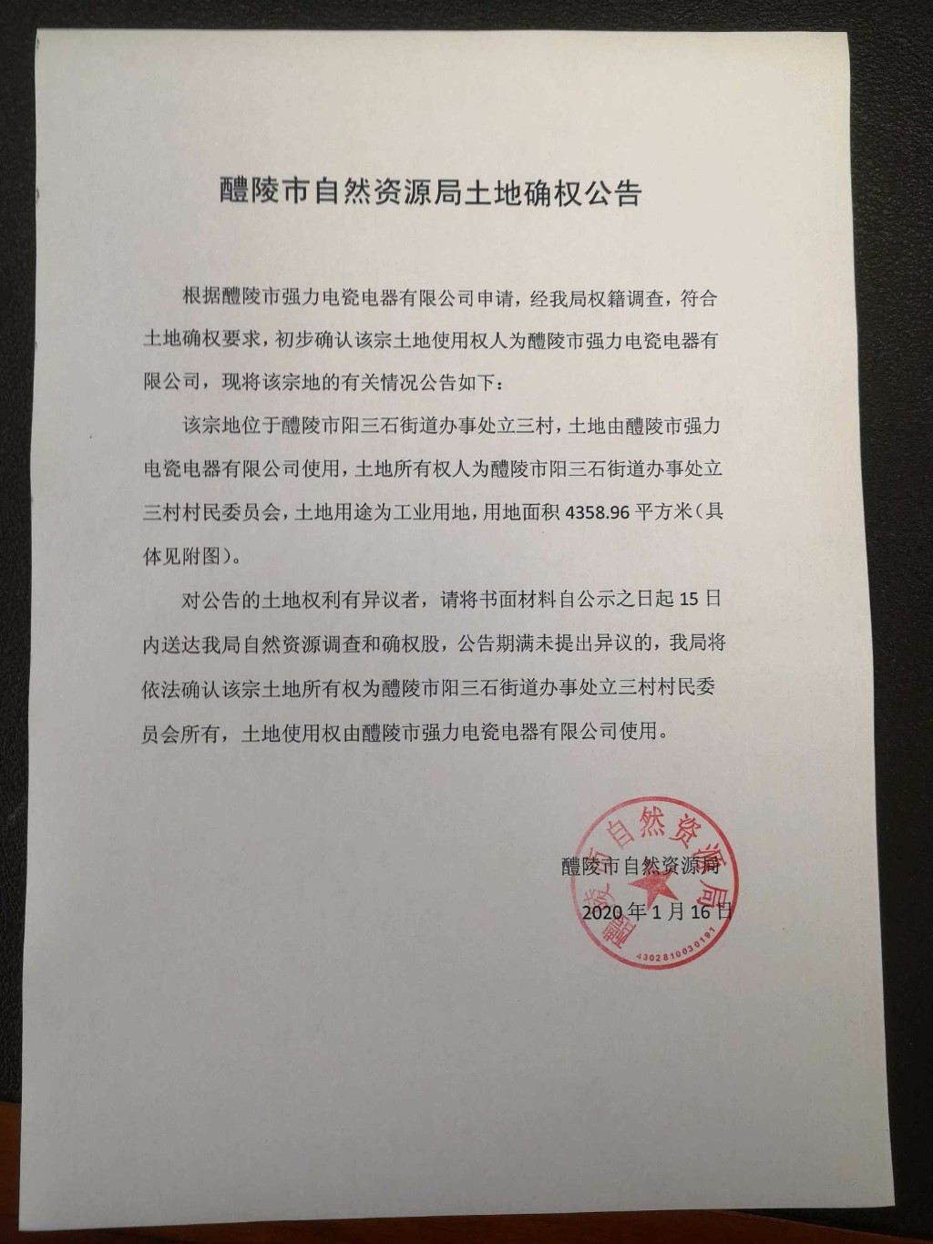 醴陵市自然资源局土地确权公告(强力电瓷电器有限公司)