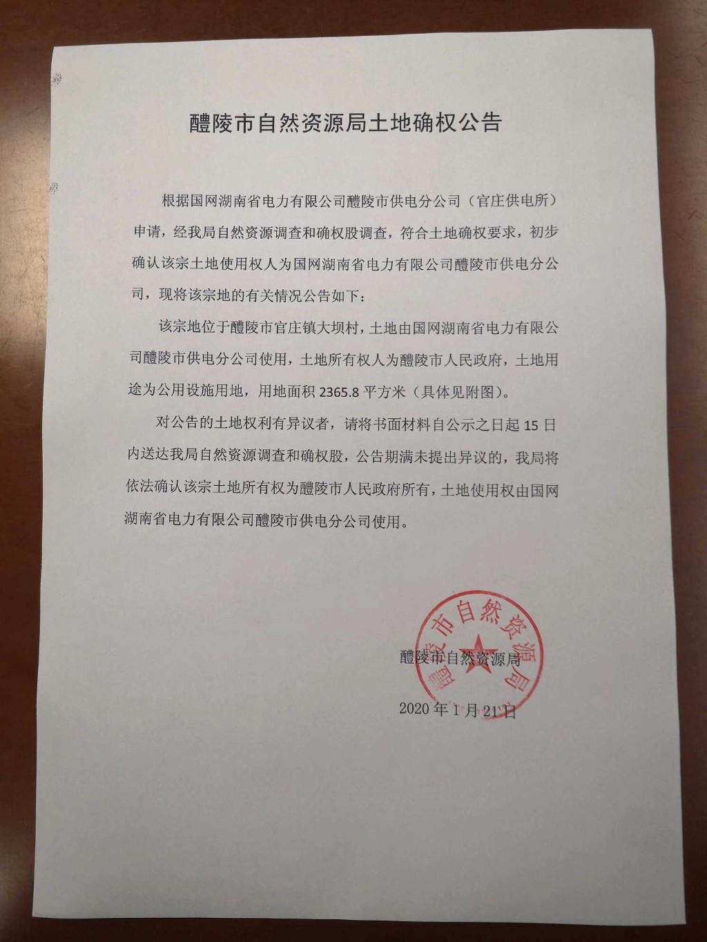 醴陵市自然资源局土地确权公告(官庄供电所)