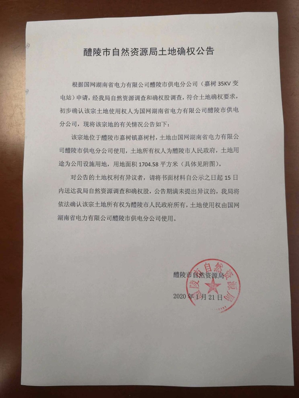 醴陵市自然资源局土地确权公告(嘉树变电站)