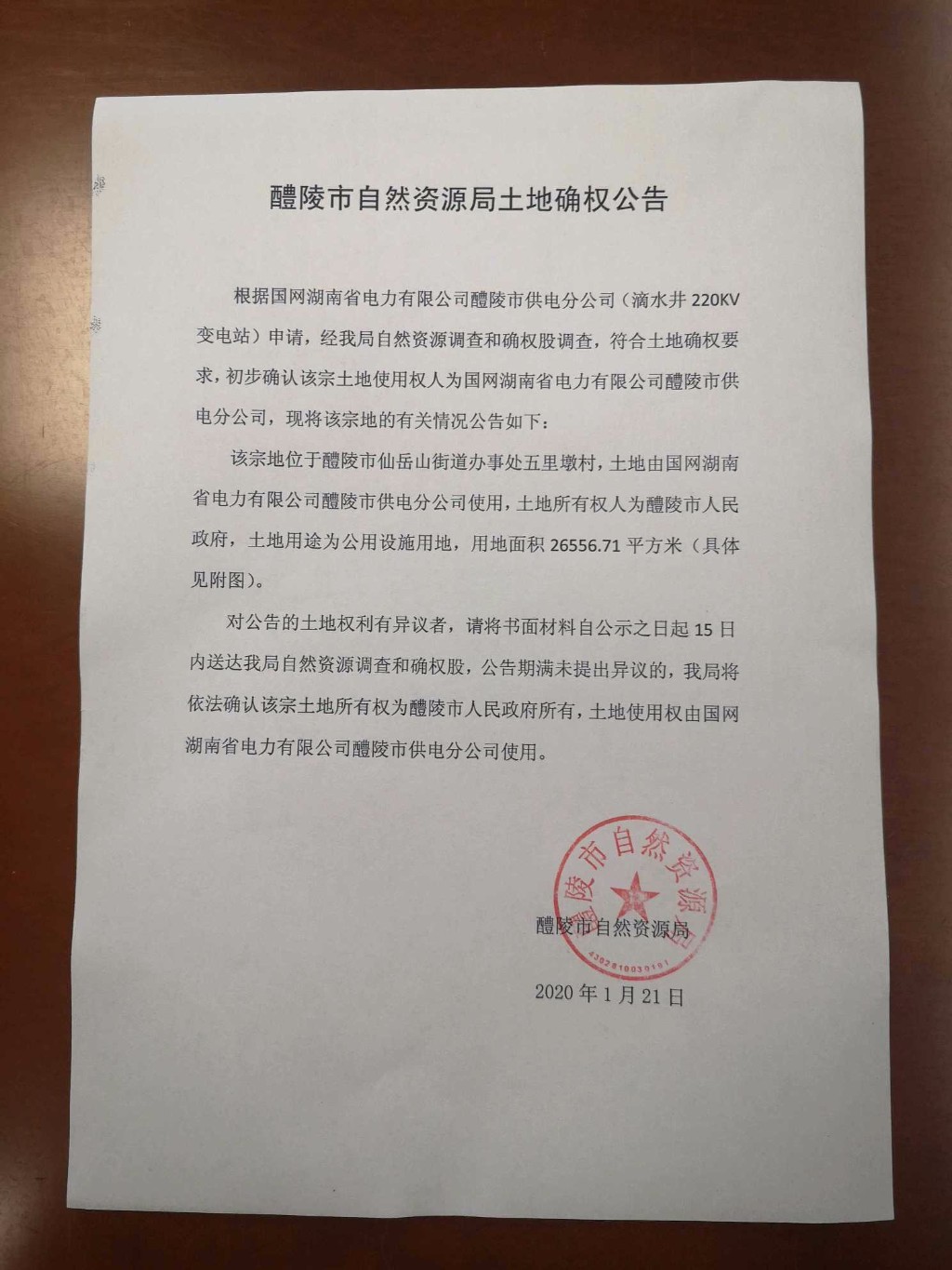 醴陵市自然资源局土地确权公告(滴水井变电站)
