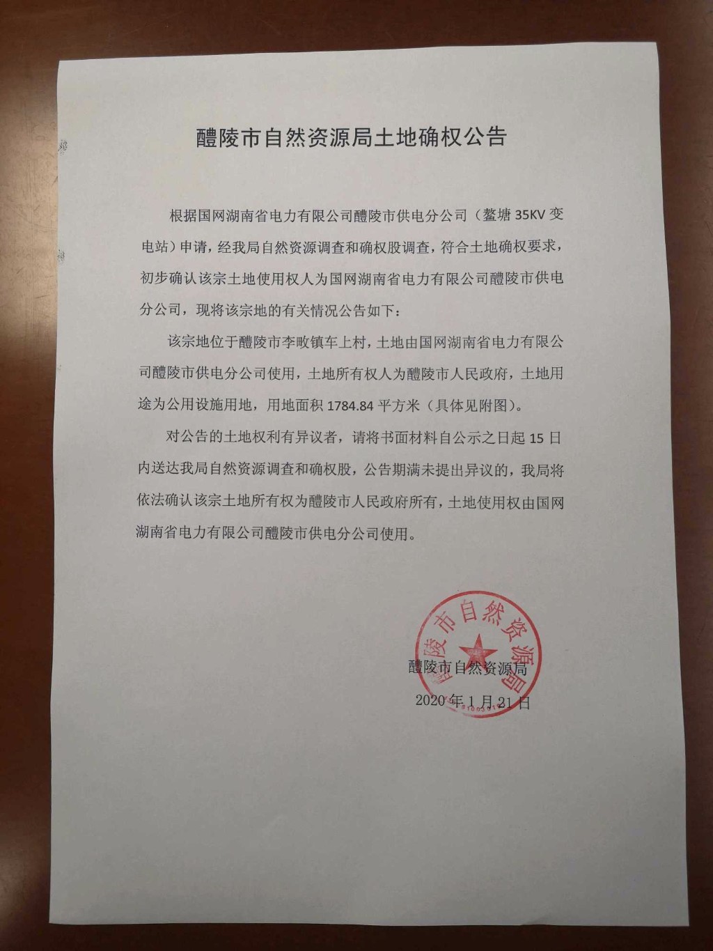 醴陵市自然资源局土地确权公告(鳌塘变电站)
