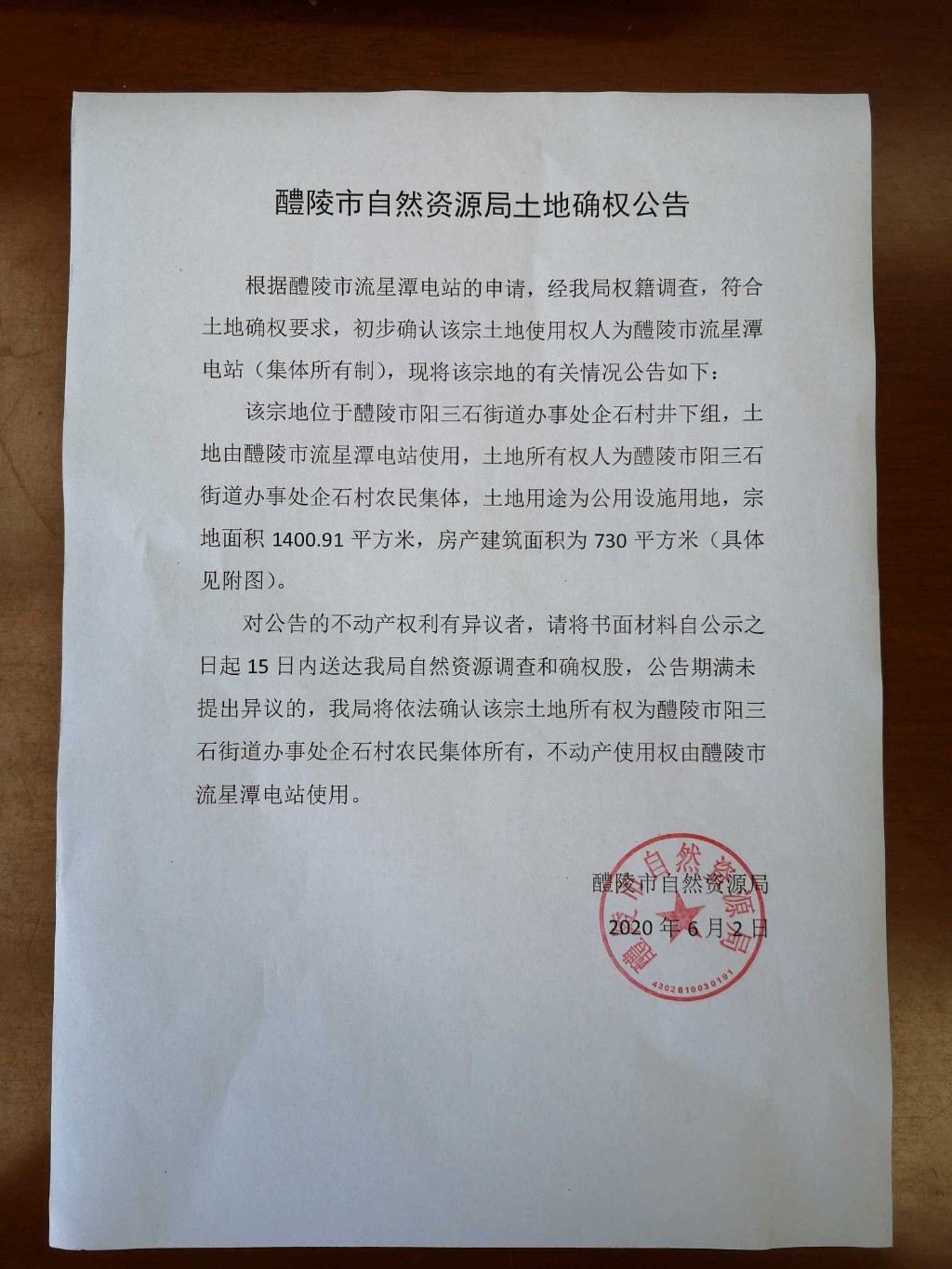 醴陵市自然资源局土地确权公告(流星潭电站)