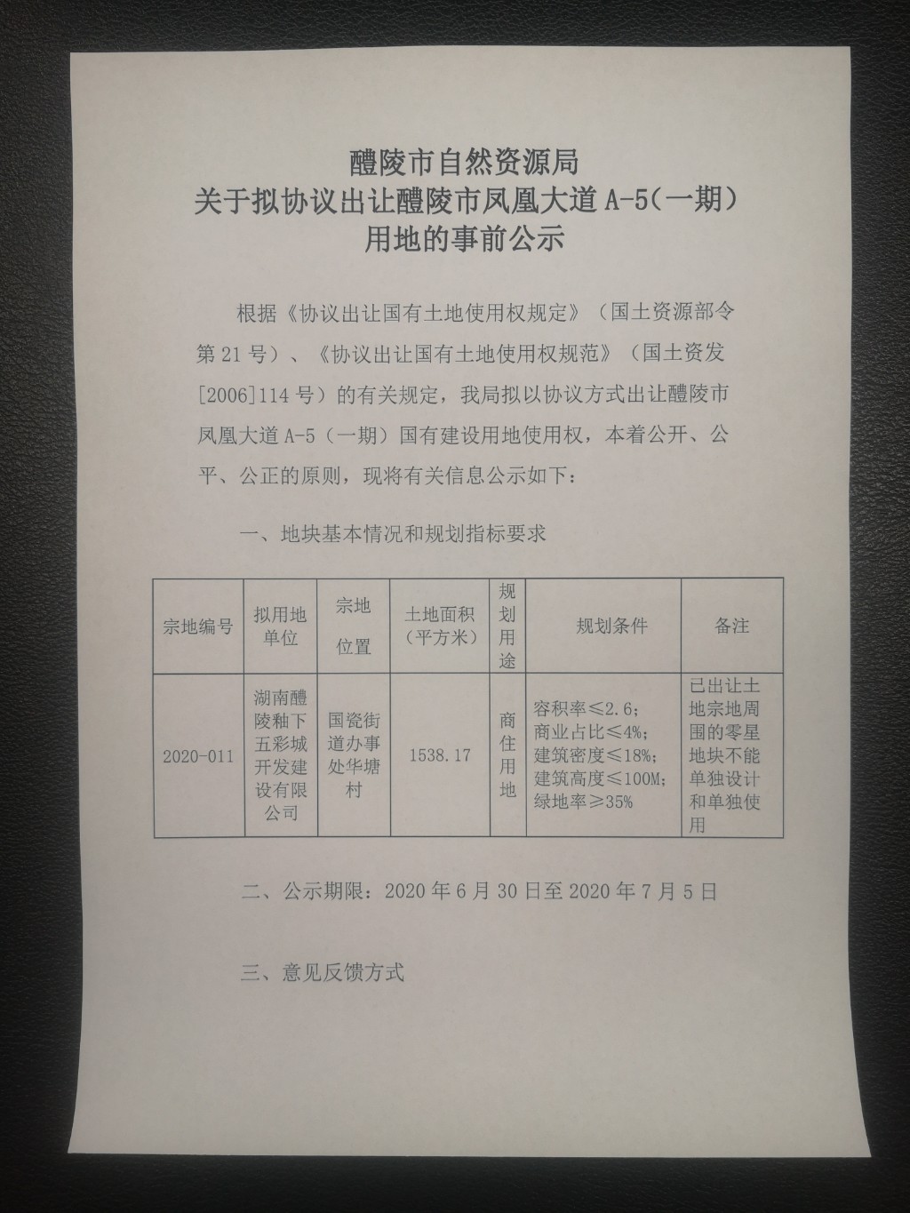 醴陵市自然资源局关于协议出让醴陵市凤凰大道A-5(一期)用地的事前公示