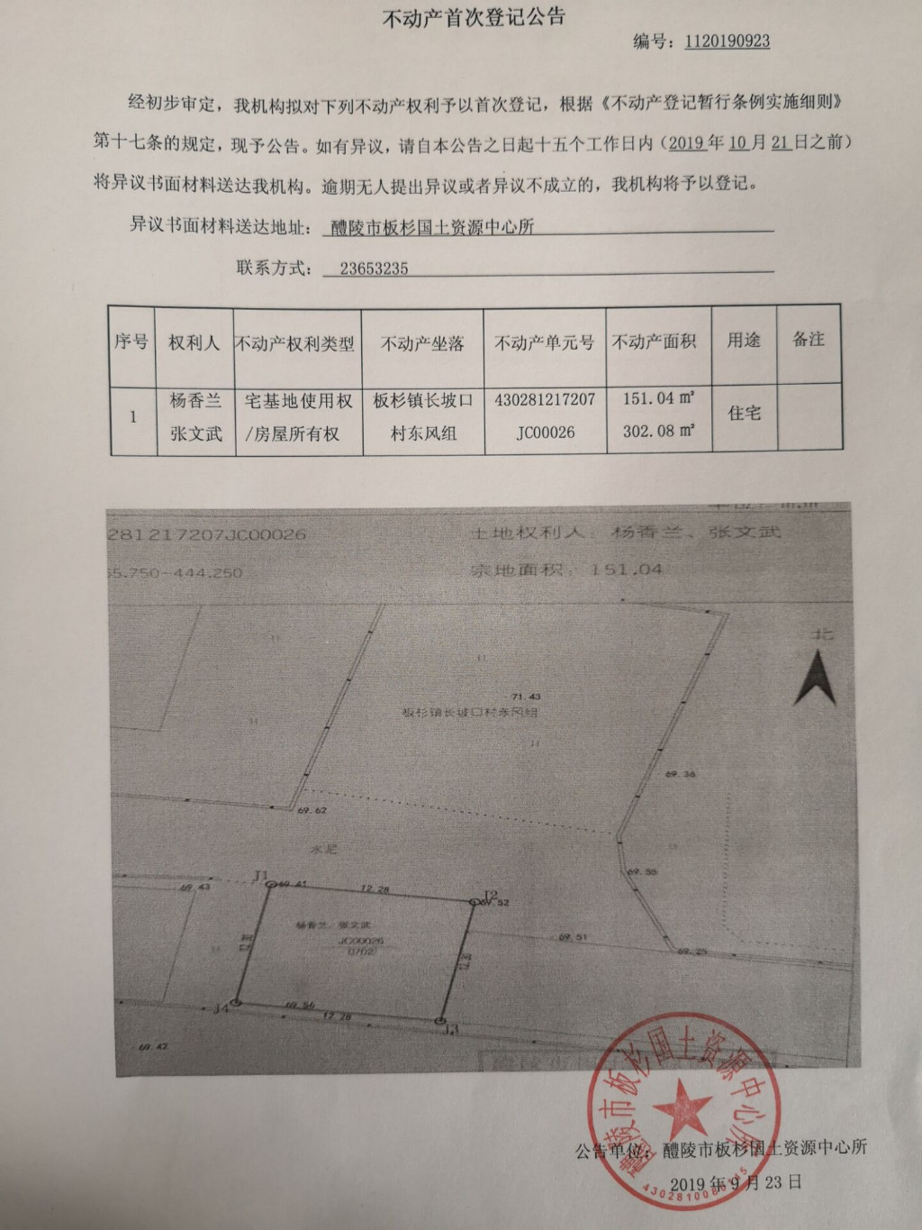 不动产首次登记公告(杨香兰 张文武)