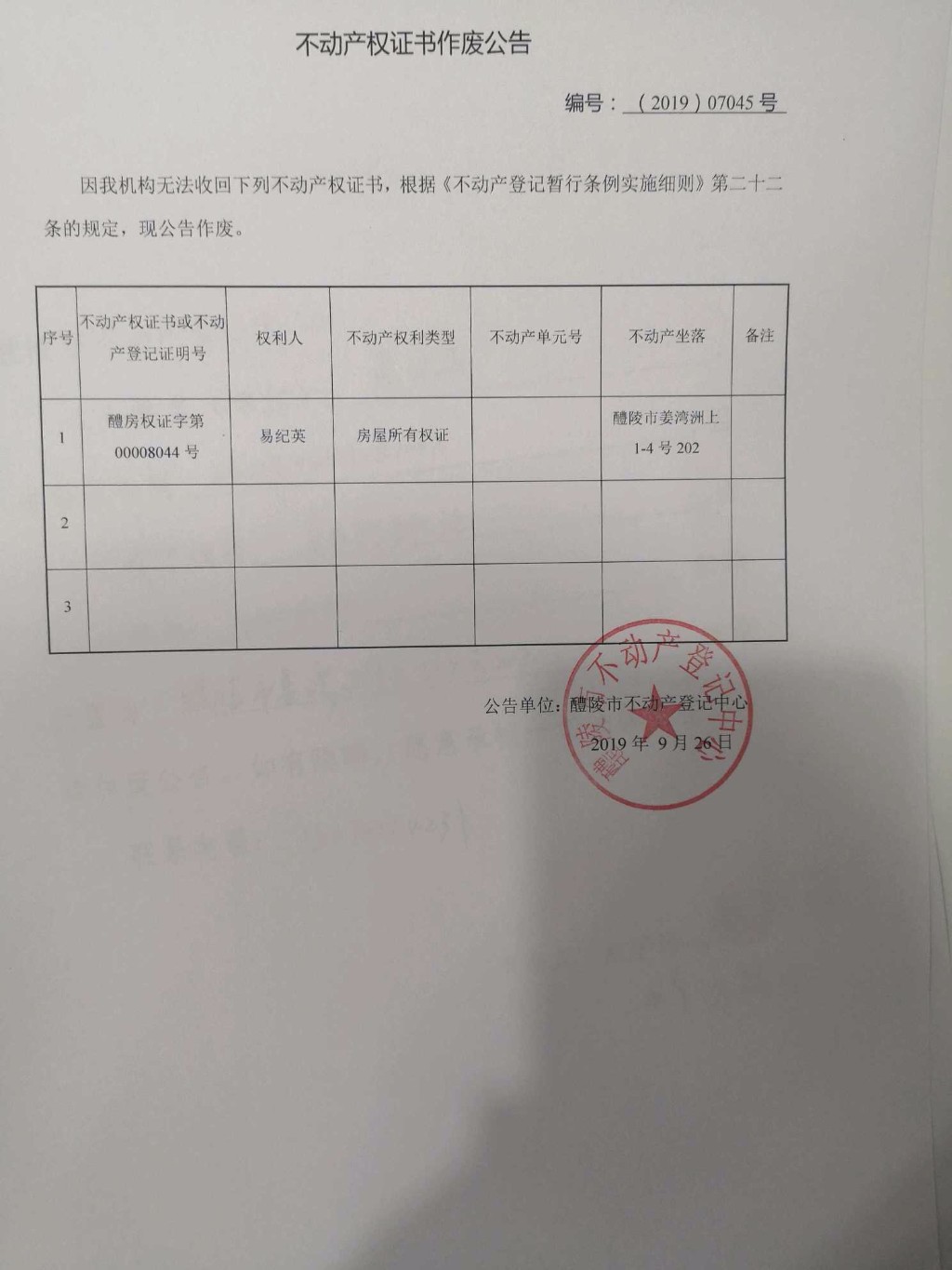 不动产权证书作废公告(易纪英)