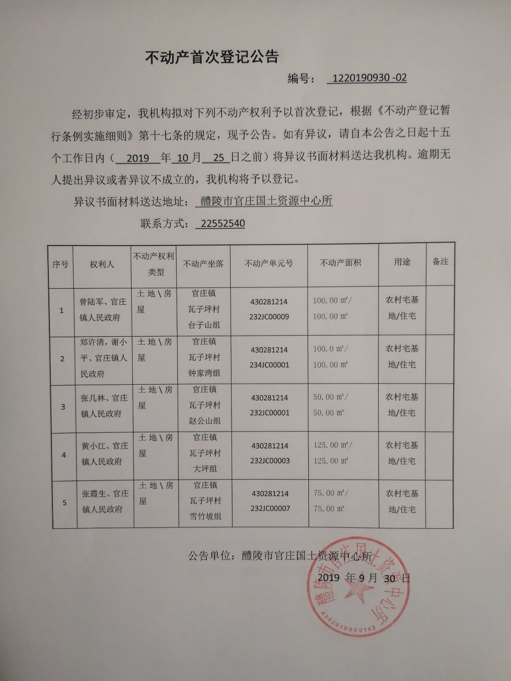 不动产首次登记公告(官庄镇瓦子坪村)