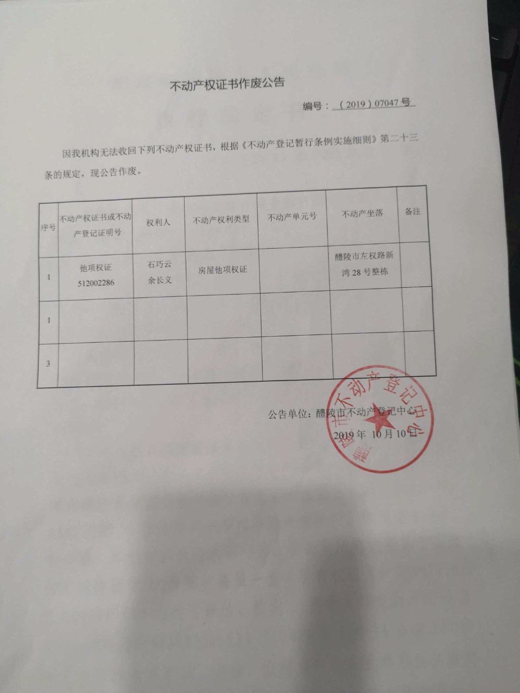 不动产权证书作废公告(石巧云、余长义)