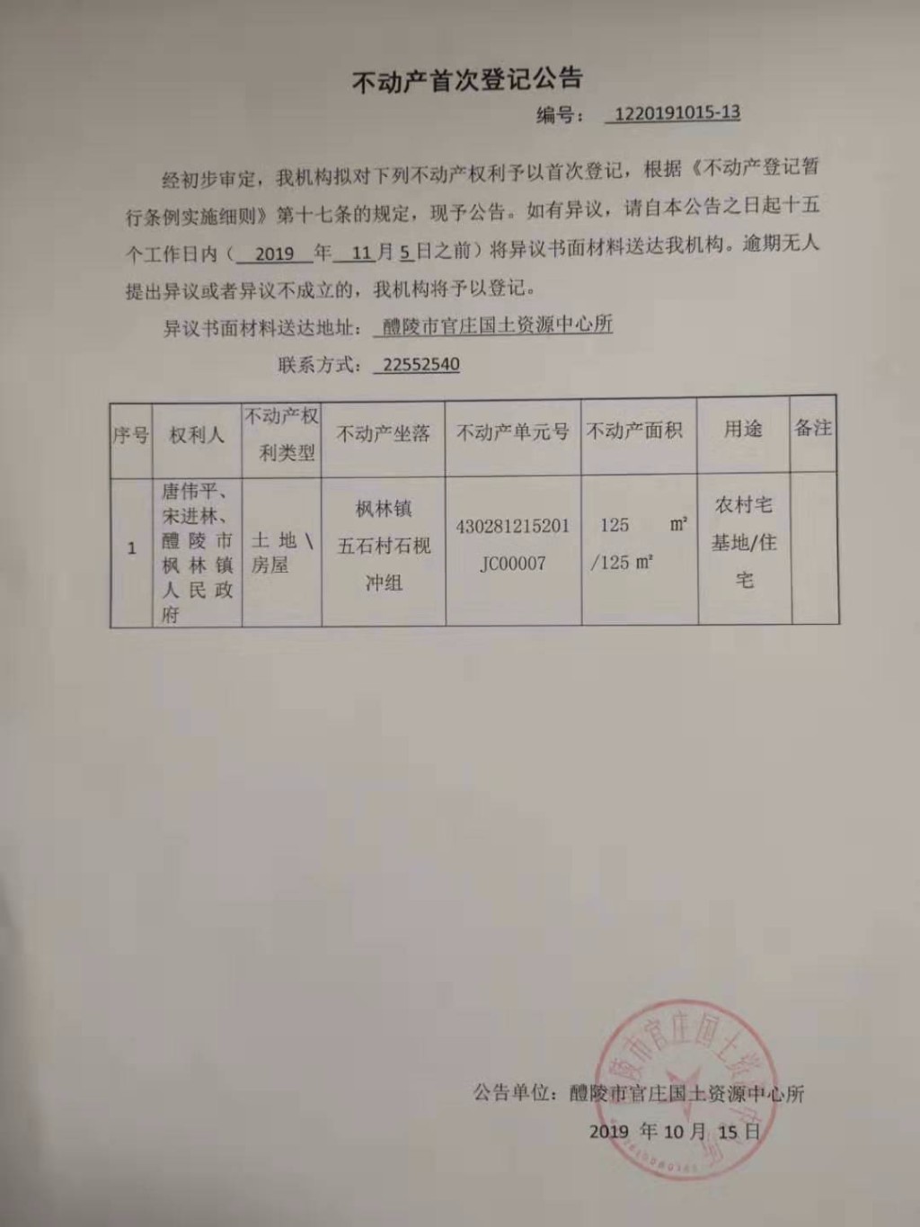 不动产首次登记公告(唐伟平.宋进林.醴陵市枫林镇人民政府)