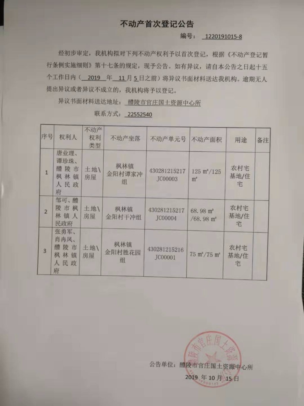 不动产首次登记公告(唐业理.谭珍珠.邹可.张勇军.肖冉凤.醴陵市枫林镇人民政府)