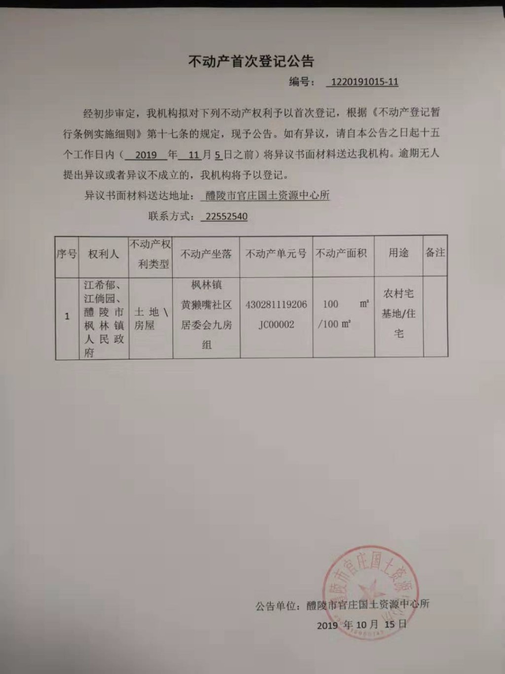 不动产首次登记公告(江希郁.江倘园.醴陵市枫林镇人民政府)