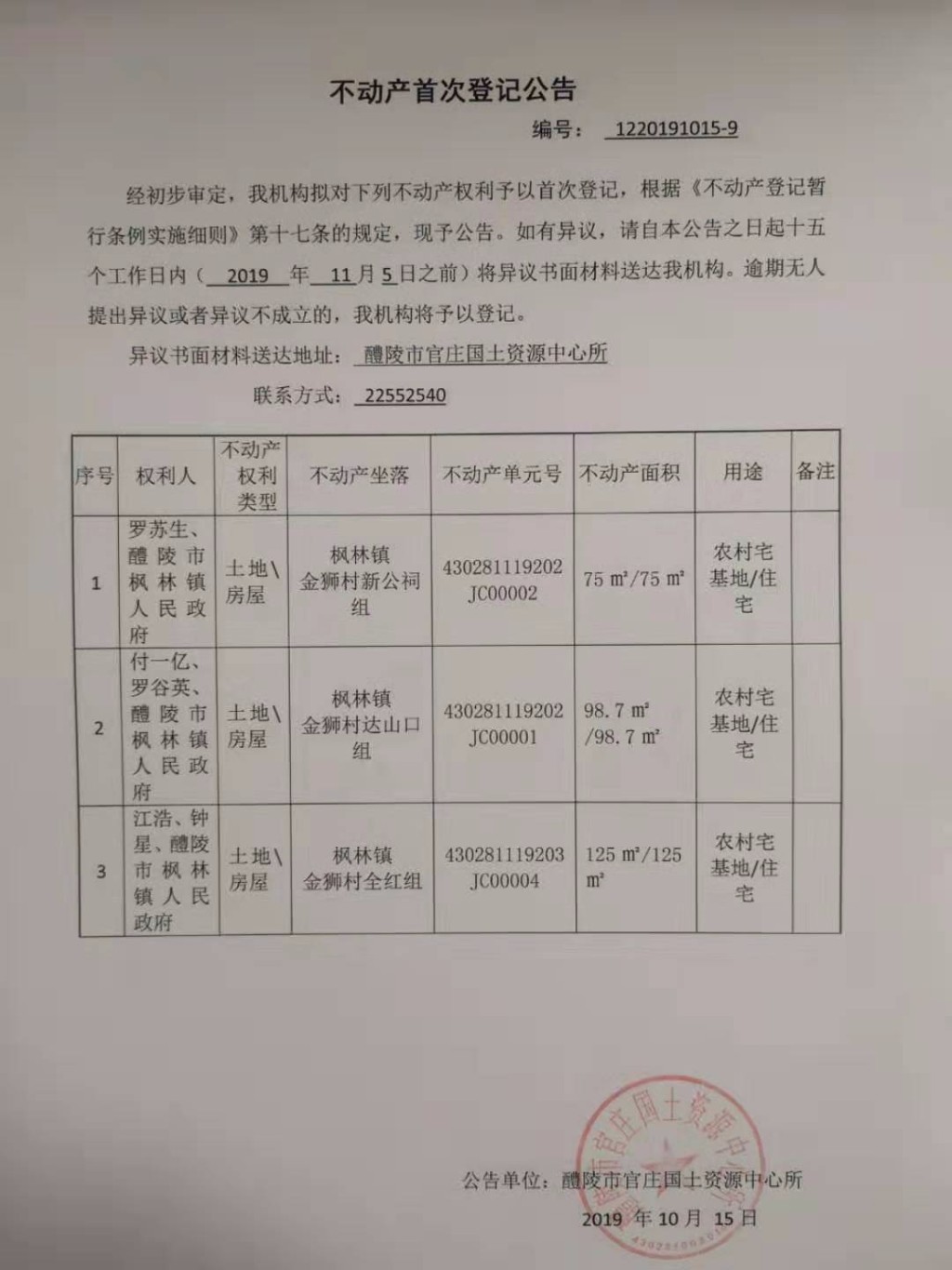 不动产首次登记公告(罗苏生.付一亿.罗谷英.江浩.钟星.醴陵市枫林镇人民政府)