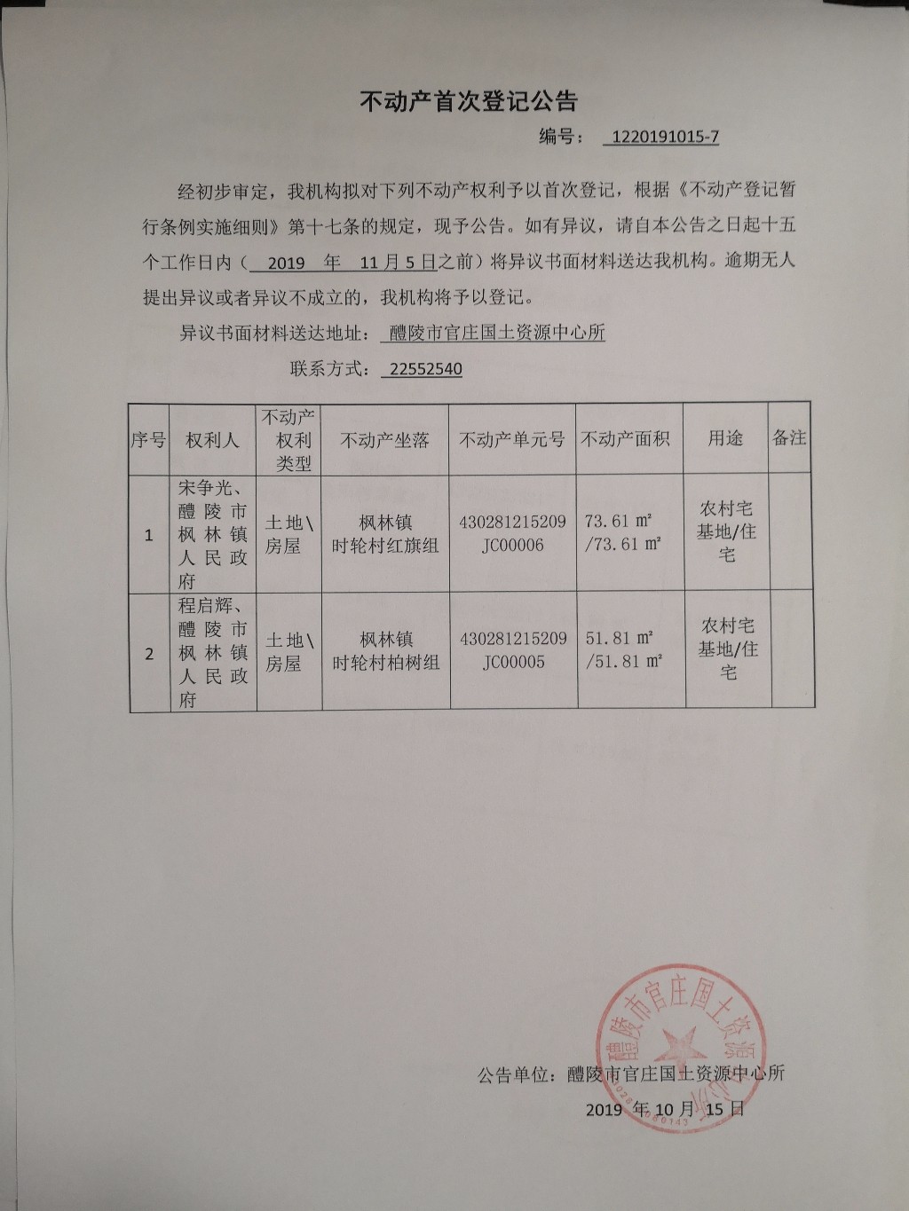 不动产首次登记公告(宋争光.程启辉.醴陵市枫林镇人民政府)