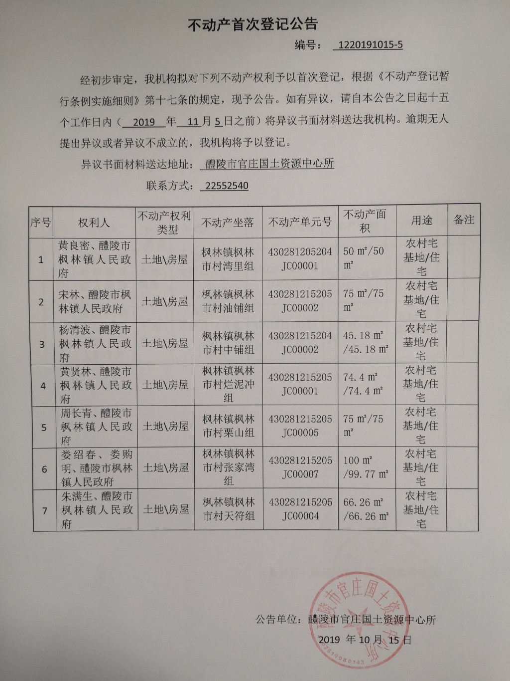 不动产首次登记公告(黄良密.宋林.杨清波.黄贤林.周长青.娄绍春.娄购明.朱满生.醴陵市枫林镇人民政府)