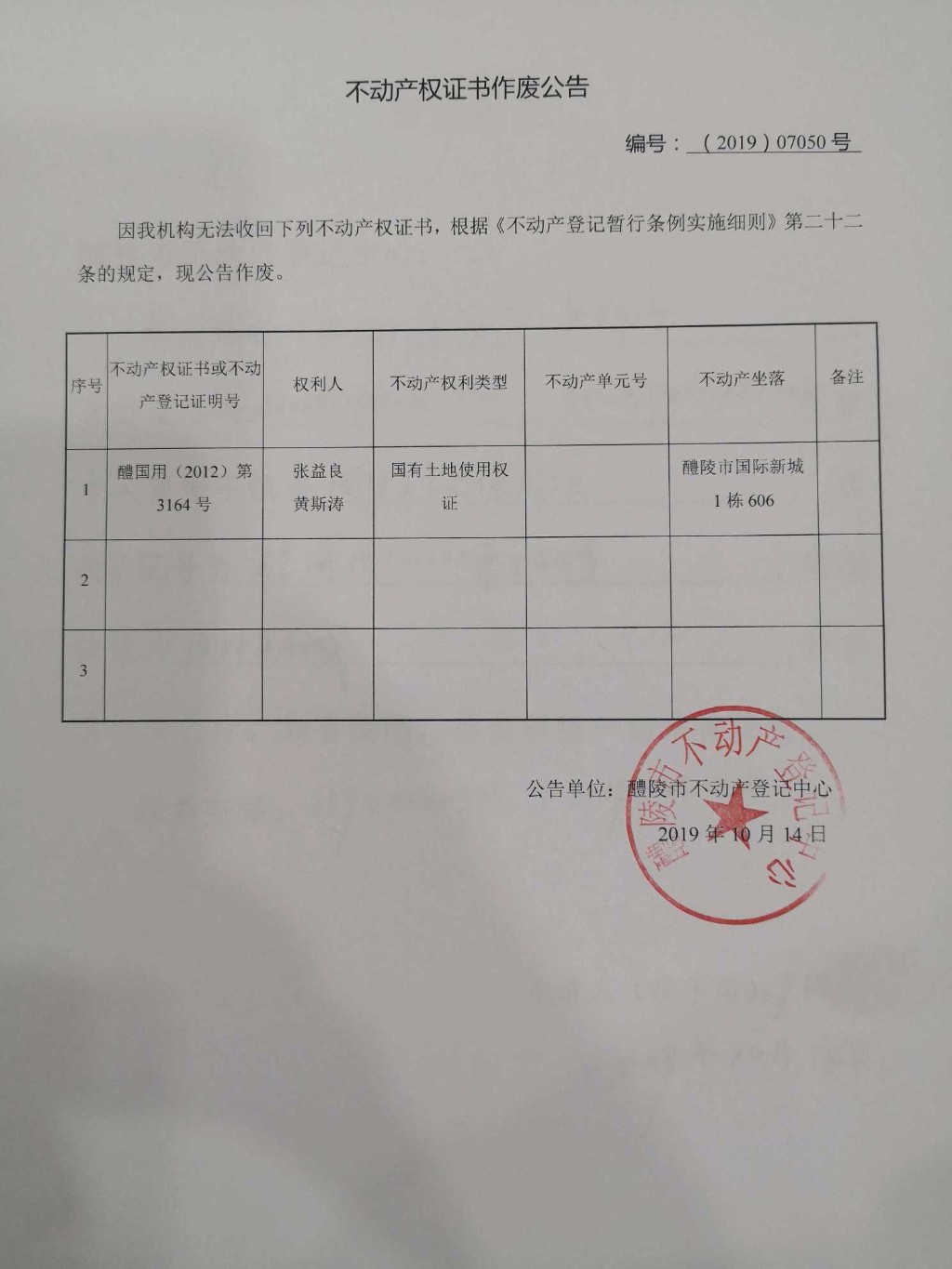 不动产权证书作废公告(张益良、黄斯涛)