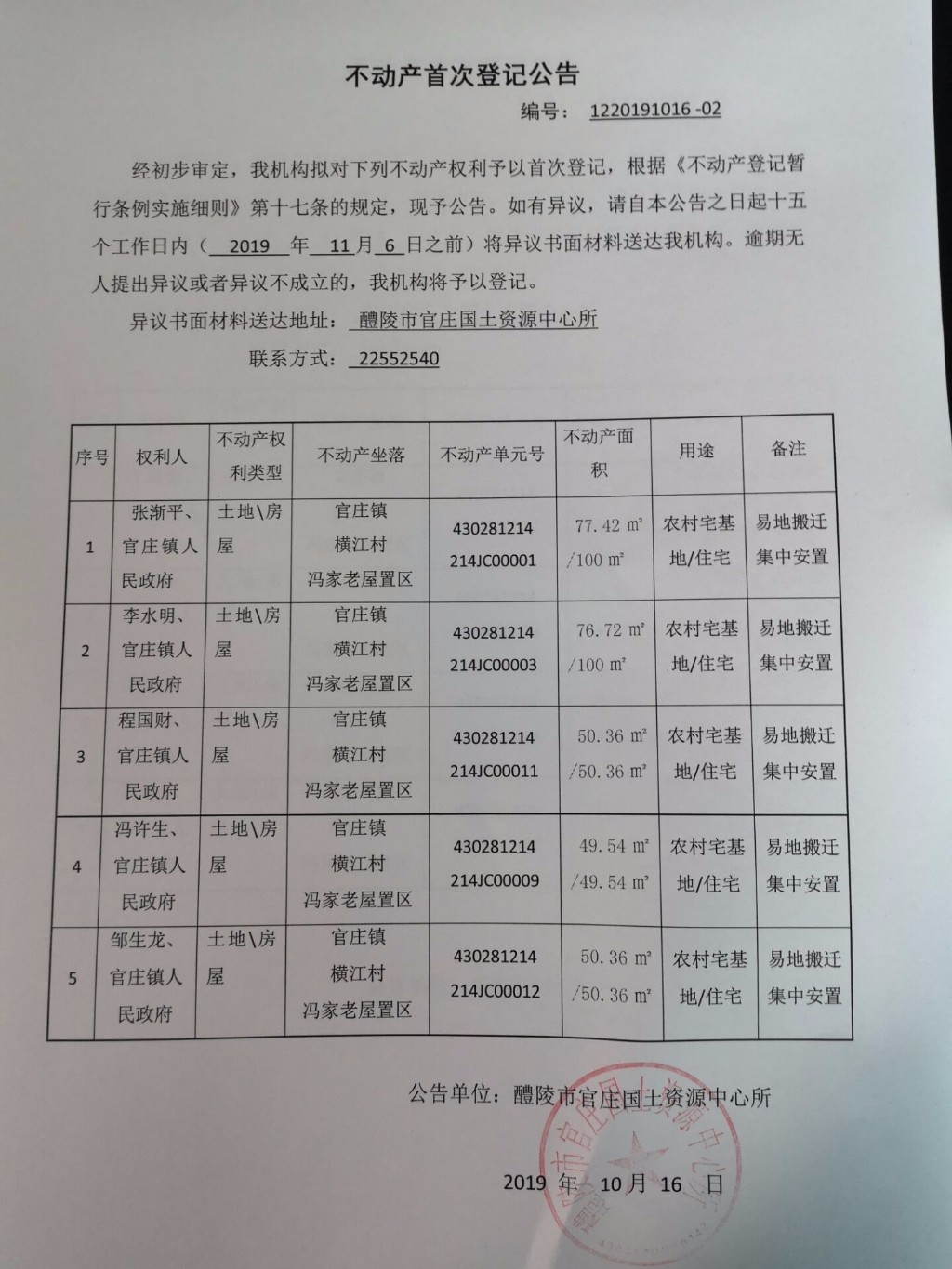不动产首次登记公告(张渐平.李水明.程国财.冯许生.邹生龙.醴陵市官庄镇人民政府)
