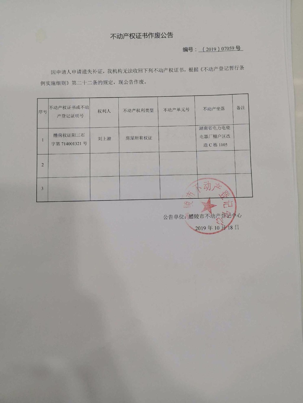 不动产权证书作废公告(刘上游)