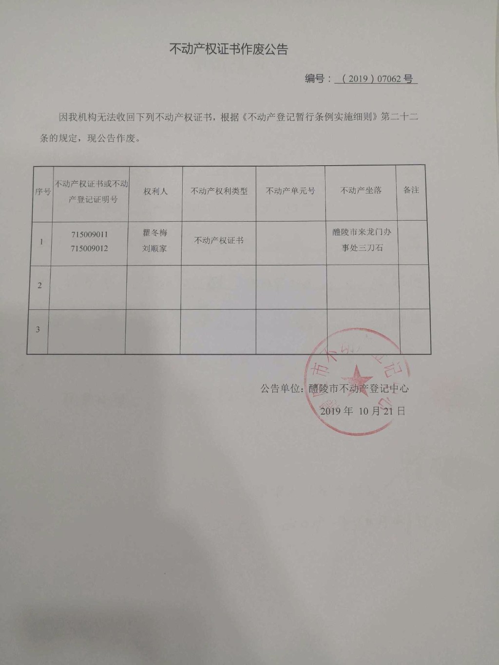 不动产权证书作废公告(瞿冬梅、刘顺家)